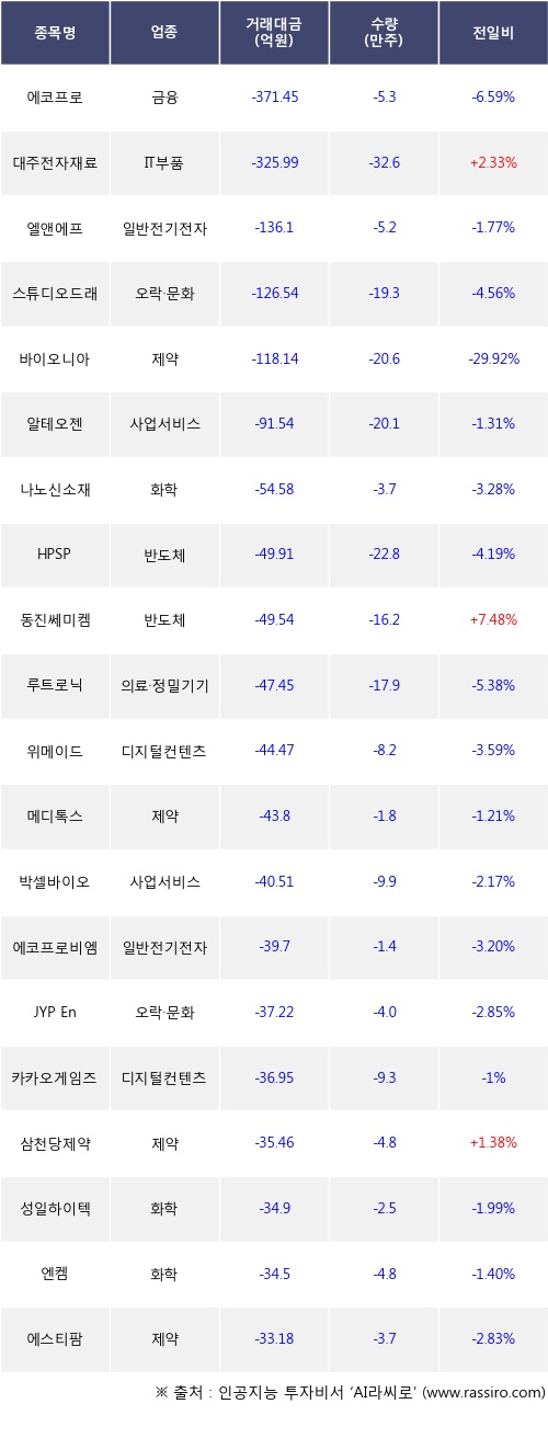 외국인 투자자의 순매도 상위 20개 종목은 에코프로, 대주전자재료, 엘앤에프, 스튜디오드래곤, 바이오니아, 알테오젠, 나노신소재, HPSP, 동진쎄미켐, 루트로닉등이다.
