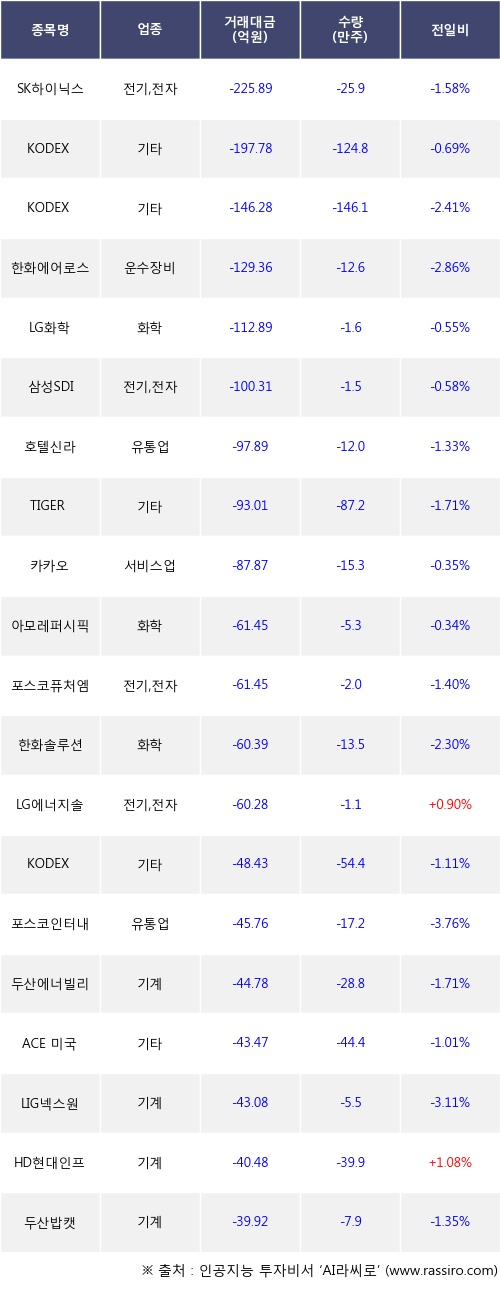 기관 투자자의 순매도 상위 20개 종목은 SK하이닉스, KODEX 레버리지, KODEX 코스닥150레버리지, 한화에어로스페이스, LG화학, 삼성SDI, 호텔신라, TIGER 차이나전기차SOLACTIVE, 카카오, 아모레퍼시픽등이다.