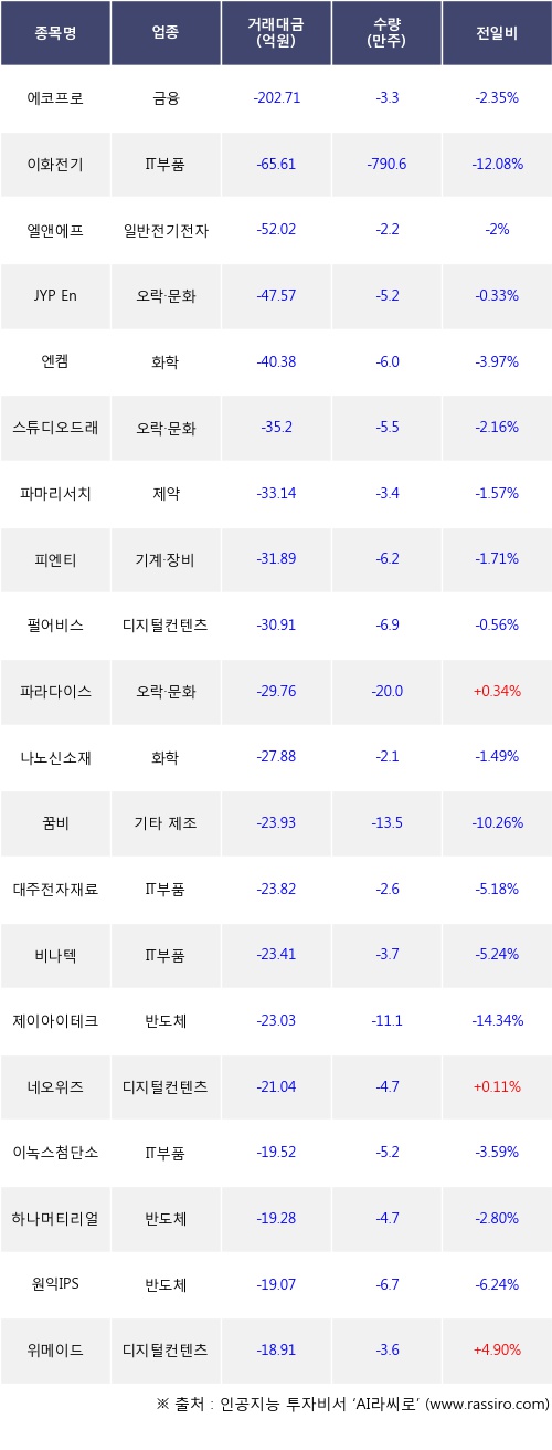 기관 투자자의 순매도 상위 20개 종목은 에코프로, 이화전기, 엘앤에프, JYP Ent., 엔켐, 스튜디오드래곤, 파마리서치, 피엔티, 펄어비스, 파라다이스등이다.