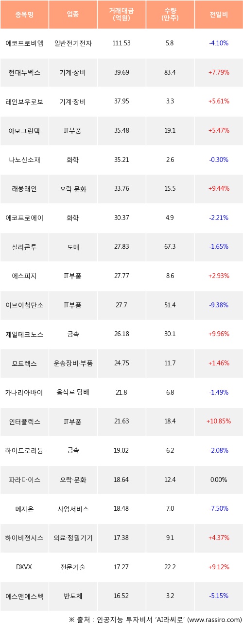외국인 투자자의 순매수 상위 20개 종목은 에코프로비엠, 현대무벡스, 레인보우로보틱스, 아모그린텍, 나노신소재, 래몽래인, 에코프로에이치엔, 실리콘투, 에스피지, 이브이첨단소재등이다.