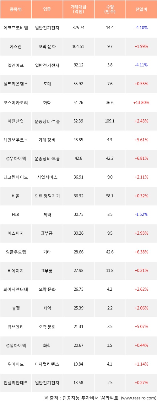 기관 투자자의 순매수 상위 20개 종목은 에코프로비엠, 에스엠, 엘앤에프, 셀트리온헬스케어, 코스메카코리아, 아진산업, 레인보우로보틱스, 성우하이텍, 레고켐바이오, 비올등이다.