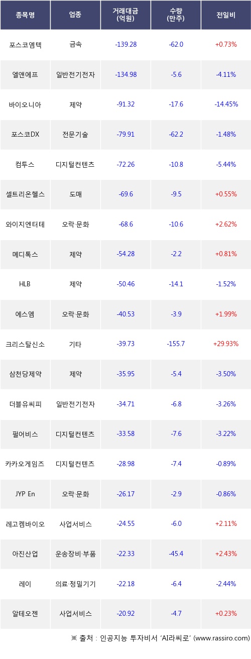 외국인 투자자의 순매도 상위 20개 종목은 포스코엠텍, 엘앤에프, 바이오니아, 포스코DX, 컴투스, 셀트리온헬스케어, 와이지엔터테인먼트, 메디톡스, HLB, 에스엠등이다.