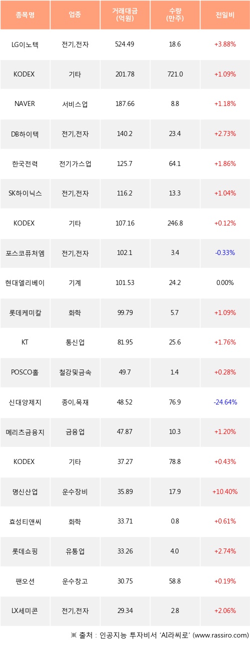 LG이노텍, KODEX 200선물인버스2X, NAVER 등은 전일 대비 주가가 상승했고, 포스코퓨처엠, 신대양제지 등은 주가가 하락했다.