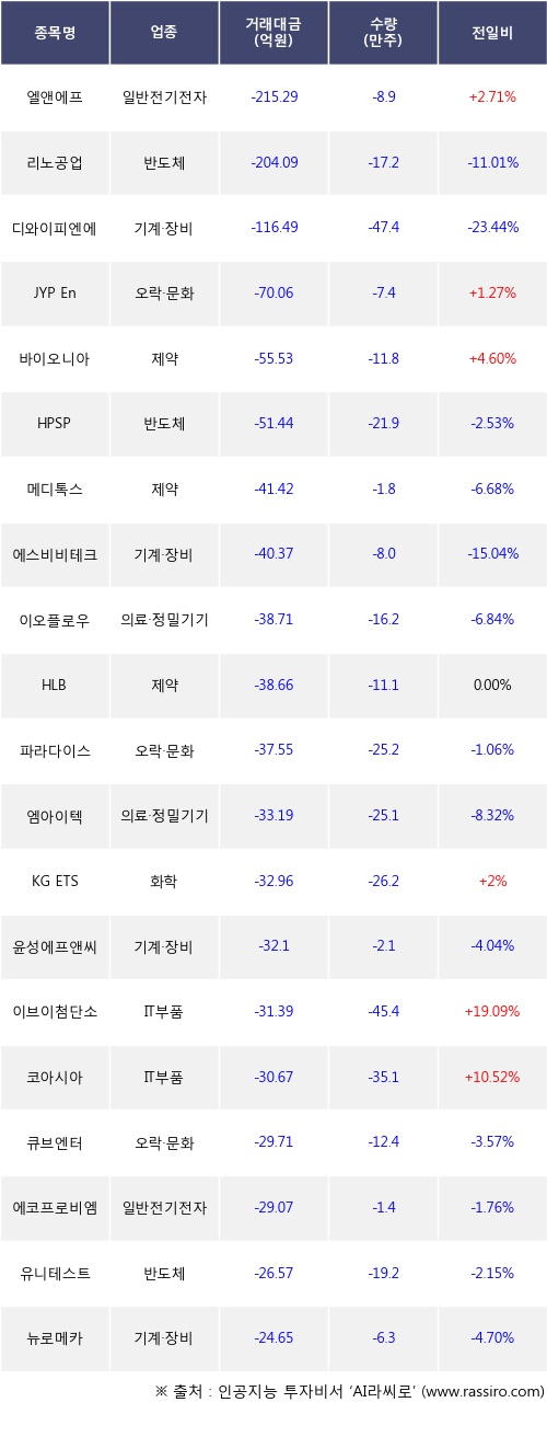 외국인 투자자의 순매도 상위 20개 종목은 엘앤에프, 리노공업, 디와이피엔에프, JYP Ent., 바이오니아, HPSP, 메디톡스, 에스비비테크, 이오플로우, HLB등이다.
