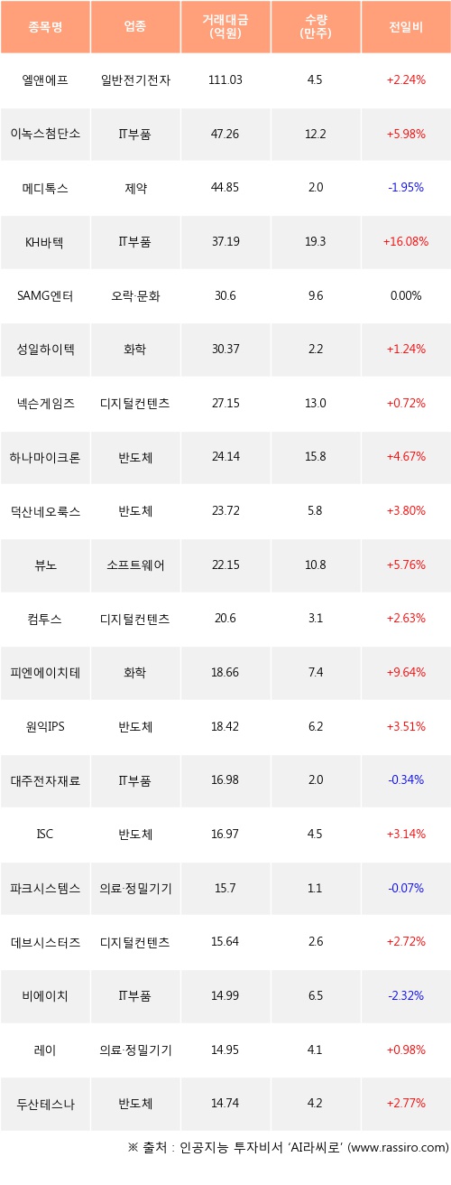 엘앤에프, 이녹스첨단소재, KH바텍 등은 전일 대비 주가가 상승했고, 메디톡스, 대주전자재료, 파크시스템스 등은 주가가 하락했다.