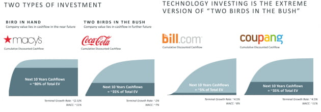 그가 정의한 '손 안의 새'는 현재 기업가치에서 향후 10년의 예상 현금흐름이 차지하는 비중이 80% 이상을 차지하는 곳을 뜻한다. 미국 내 대표 리테일기업인 메이씨스를 사례로 들었다. 예측 가능하고 안정적인 수익을 창출하지만 미래 성장성은 떨어진다. 좀 더 나아간 '숲 속의 한마리 새'는 현금흐름 비중이 35% 미만인 기업을 의미한다. 시장 내 회사가 가진 가격경쟁력과 브랜드 인지도 등 대체불가능한 요인들이 나머지를 채운다. 대표적인 기업이 코카콜라다.
