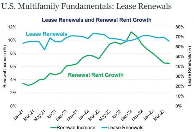 슬론 디렉터는 "친기업적인 선벨트 시장은 가격도 오르고 인구 밀집도도 높아져 대응해야 한다"며 "임대로 거주하려는 인구가 늘어나고 있어 주택을 빌려 월세로 거주하려는 성향이 지속될 것으로 보고 있다"고 설명했다. 그러면서 "포트폴리오 내에서 살펴보면 전월 대비 임대료 상승률은 2021년 초까지 2.5~3.0%까지 늘었으나 다시 하락세를 보인다"며 "금리 상승으로 인해 임대계약 갱신율을 보면 70%대 수준을 유지하고 있다"고 분석했다.