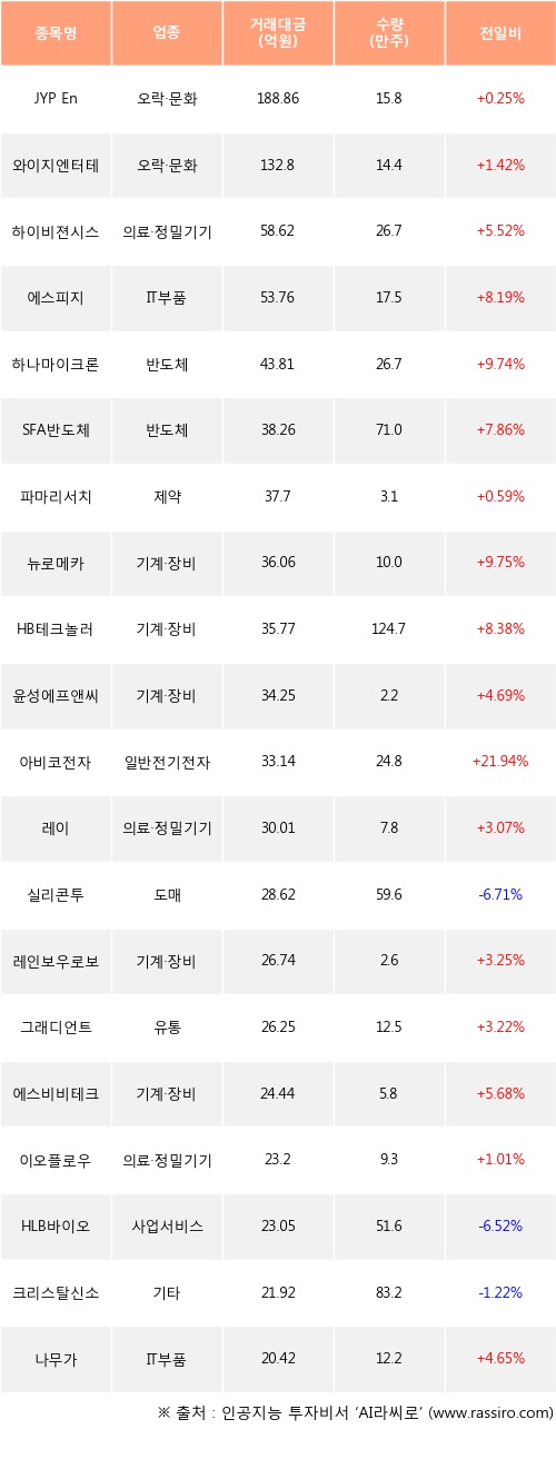 JYP Ent., 와이지엔터테인먼트, 하이비젼시스템 등은 전일 대비 주가가 상승했고, 실리콘투, HLB바이오스텝, 크리스탈신소재 등은 주가가 하락했다.