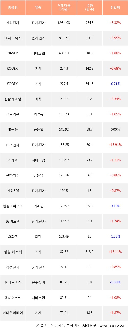 기관 투자자의 순매수 상위 20개 종목은 삼성전자, SK하이닉스, NAVER, KODEX 레버리지, KODEX 코스닥150선물인버스, 한솔케미칼, 셀트리온, KB금융, 대덕전자, 카카오등이다.