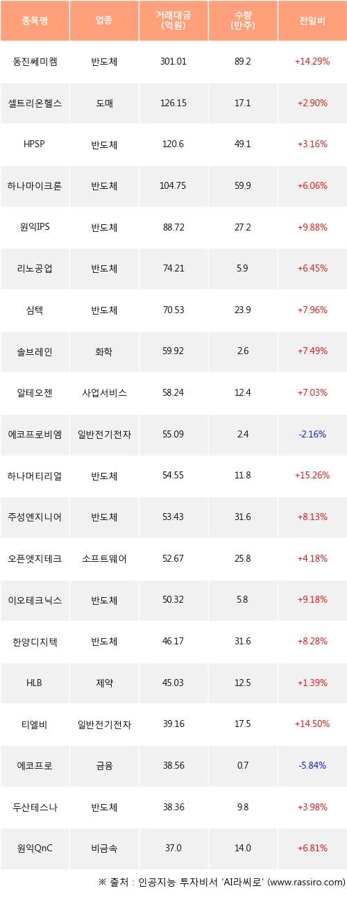 기관 투자자의 순매수 상위 20개 종목은 동진쎄미켐, 셀트리온헬스케어, HPSP, 하나마이크론, 원익IPS, 리노공업, 심텍, 솔브레인, 알테오젠, 에코프로비엠등이다.