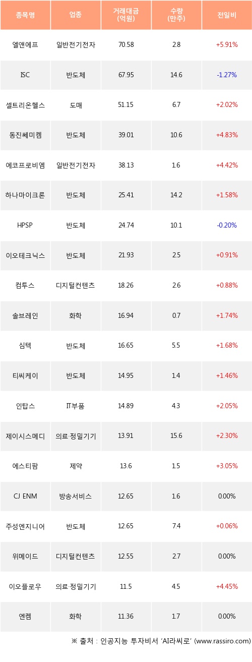 기관 투자자의 순매수 상위 20개 종목은 엘앤에프, ISC, 셀트리온헬스케어, 동진쎄미켐, 에코프로비엠, 하나마이크론, HPSP, 이오테크닉스, 컴투스, 솔브레인등이다.