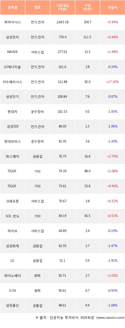 외국인 투자자의 순매수 상위 20개 종목은 SK하이닉스, 삼성전자, NAVER, LG에너지솔루션, 이수페타시스, 삼성전기, 현대차, 삼성SDI, 현대모비스, SK스퀘어등이다.