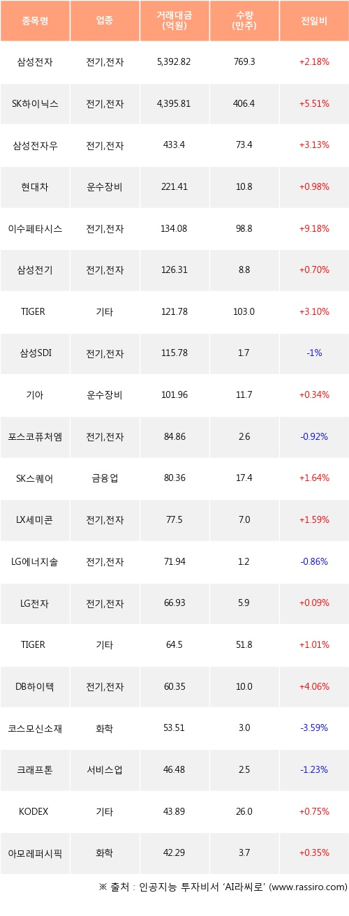 외국인 투자자의 순매수 상위 20개 종목은 삼성전자, SK하이닉스, 삼성전자우, 현대차, 이수페타시스, 삼성전기, TIGER 미국필라델피아반도체나스닥, 삼성SDI, 기아, 포스코퓨처엠등이다.