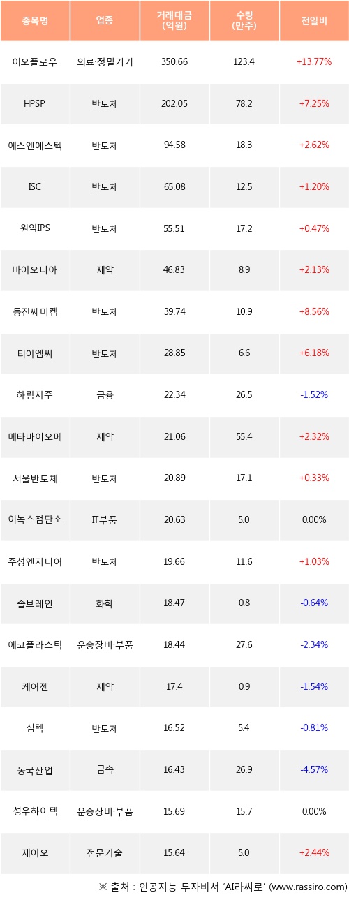 외국인 투자자의 순매수 상위 20개 종목은 이오플로우, HPSP, 에스앤에스텍, ISC, 원익IPS, 바이오니아, 동진쎄미켐, 티이엠씨, 하림지주, 메타바이오메드등이다.