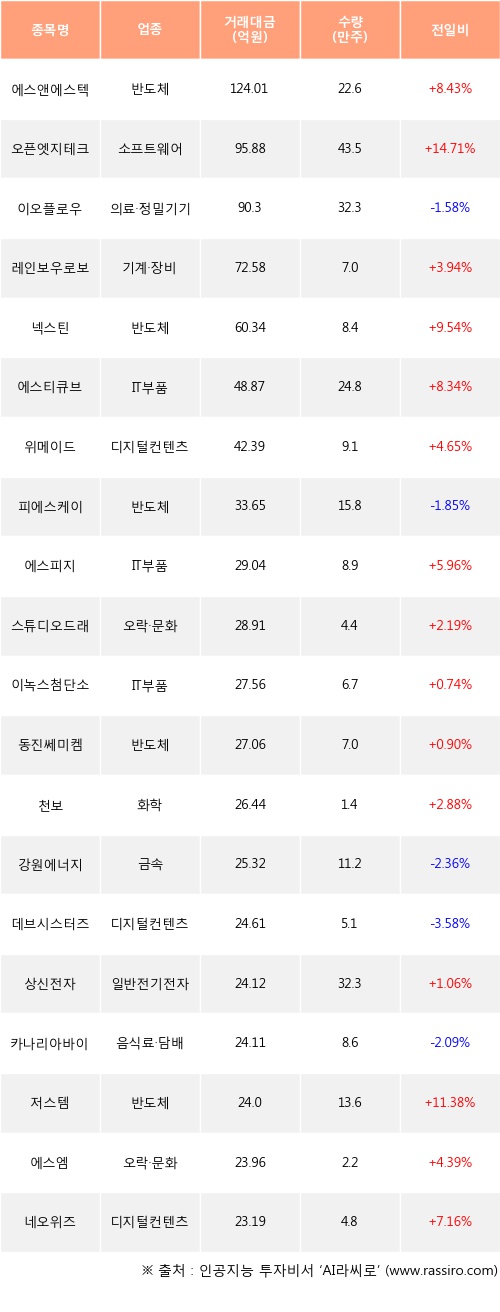 외국인 투자자의 순매수 상위 20개 종목은 에스앤에스텍, 오픈엣지테크놀로지, 이오플로우, 레인보우로보틱스, 넥스틴, 에스티큐브, 위메이드, 피에스케이, 에스피지, 스튜디오드래곤등이다.