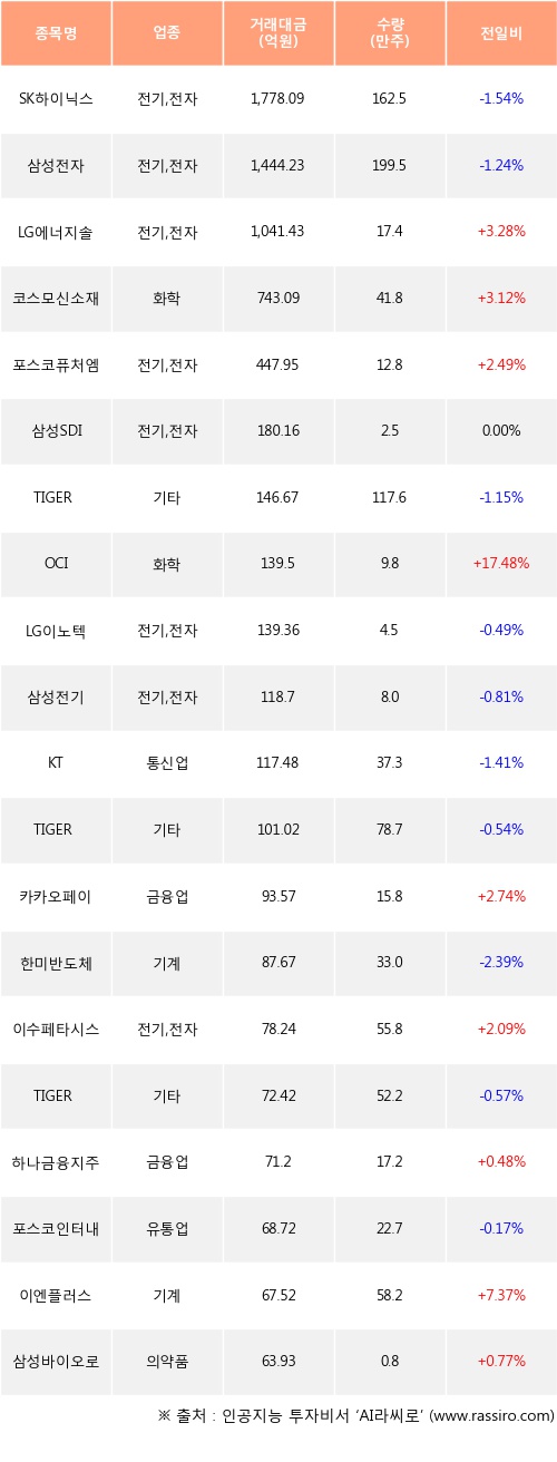 LG에너지솔루션, 코스모신소재, 포스코퓨처엠 등은 전일 대비 주가가 상승했고, SK하이닉스, 삼성전자, TIGER 미국필라델피아반도체나스닥 등은 주가가 하락했다.