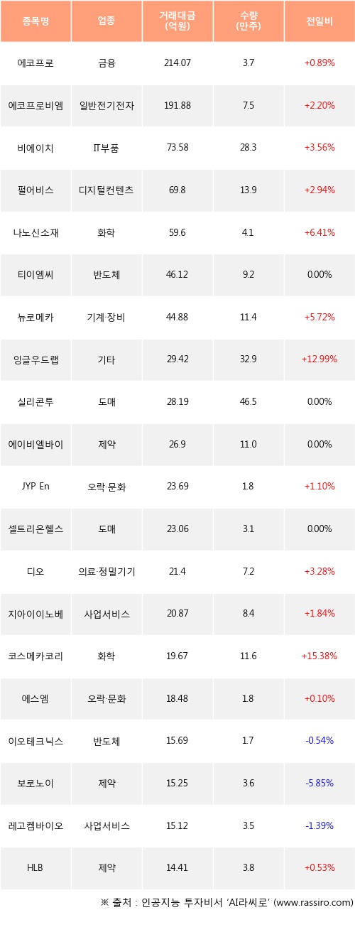 에코프로, 에코프로비엠, 비에이치 등은 전일 대비 주가가 상승했고, 이오테크닉스, 보로노이, 레고켐바이오 등은 주가가 하락했다.