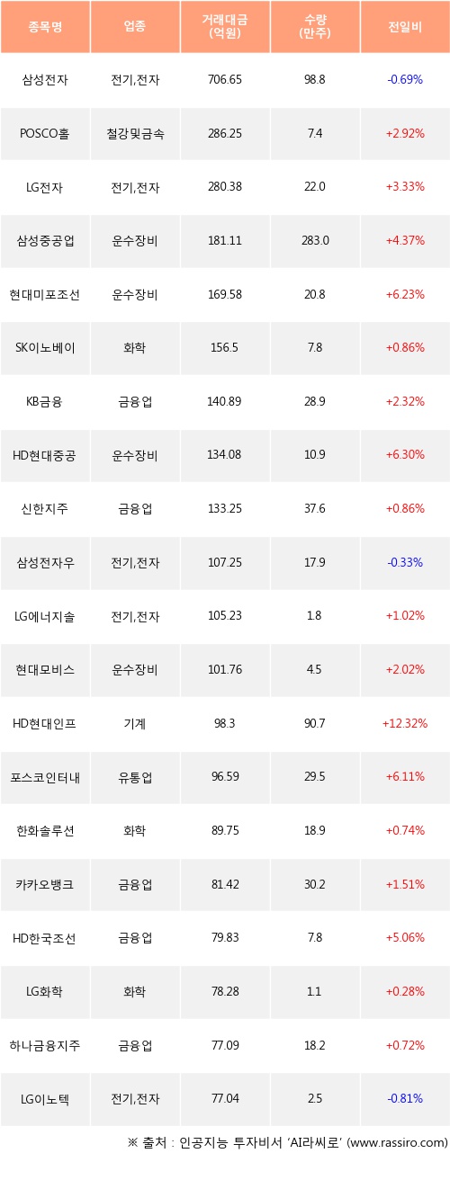 POSCO홀딩스, LG전자, 삼성중공업 등은 전일 대비 주가가 상승했고, 삼성전자, 삼성전자우, LG이노텍 등은 주가가 하락했다.