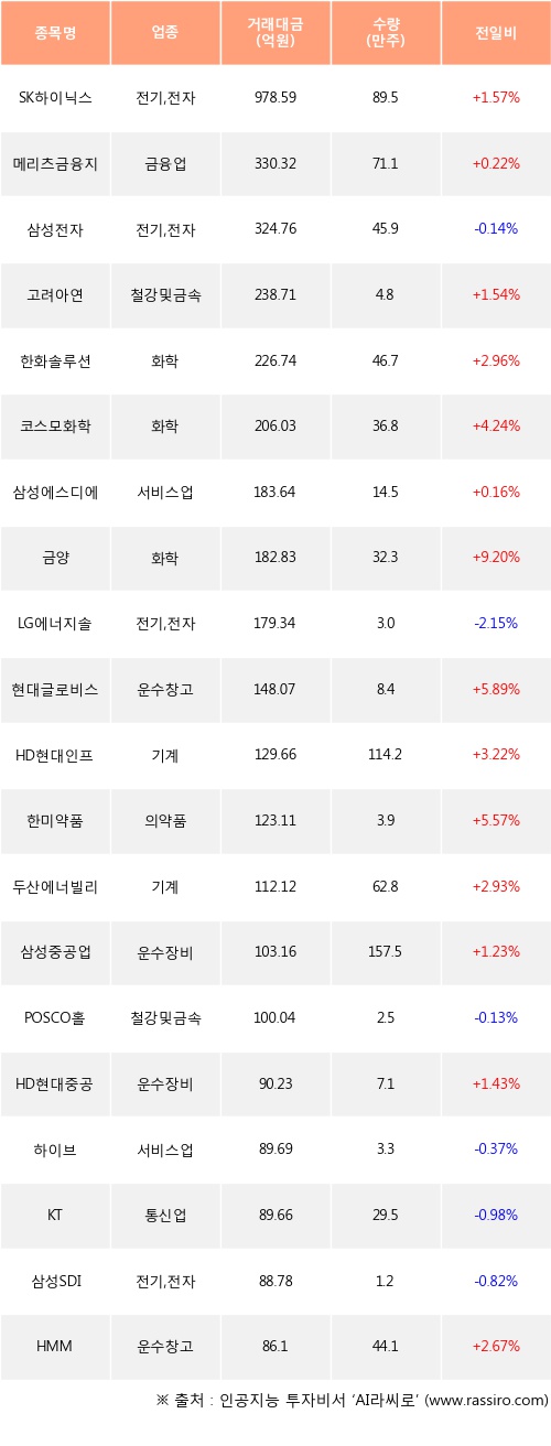 기관 투자자의 순매수 상위 20개 종목은 SK하이닉스, 메리츠금융지주, 삼성전자, 고려아연, 한화솔루션, 코스모화학, 삼성에스디에스, 금양, LG에너지솔루션, 현대글로비스등이다.