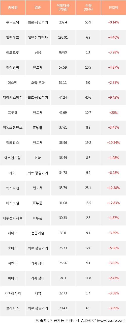 기관 투자자의 순매수 상위 20개 종목은 루트로닉, 엘앤에프, 에코프로, 티이엠씨, 에스엠, 제이시스메디칼, 프로텍, 이녹스첨단소재, 텔레칩스, 에코앤드림등이다.