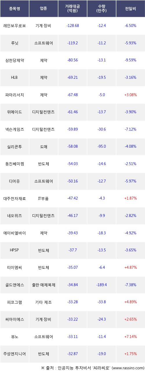 외국인 투자자의 순매도 상위 20개 종목은 레인보우로보틱스, 루닛, 삼천당제약, HLB, 파마리서치, 위메이드, 넥슨게임즈, 실리콘투, 동진쎄미켐, 디어유등이다.