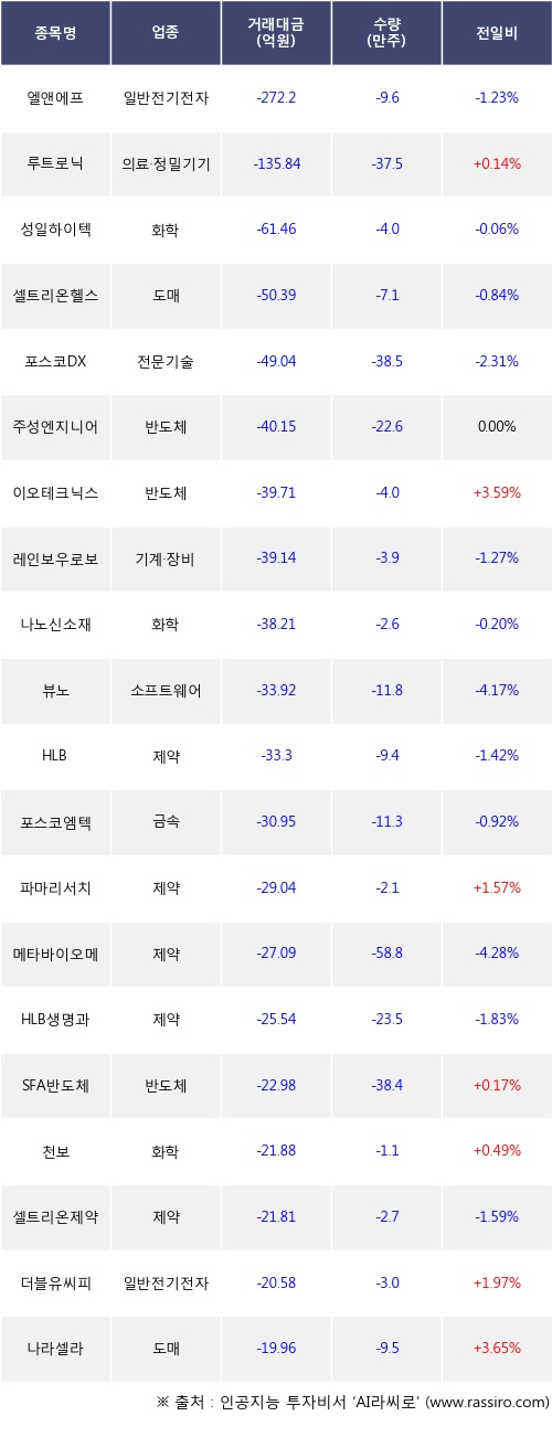 외국인 투자자의 순매도 상위 20개 종목은 엘앤에프, 루트로닉, 성일하이텍, 셀트리온헬스케어, 포스코DX, 주성엔지니어링, 이오테크닉스, 레인보우로보틱스, 나노신소재, 뷰노등이다.