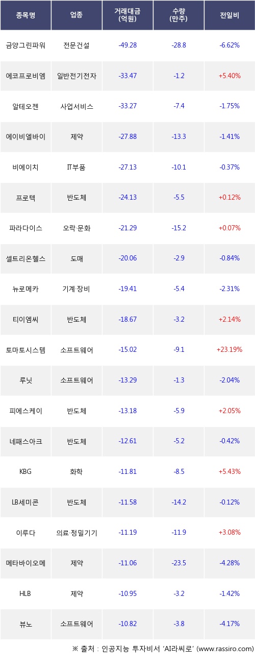 기관 투자자의 순매도 상위 20개 종목은 금양그린파워, 에코프로비엠, 알테오젠, 에이비엘바이오, 비에이치, 프로텍, 파라다이스, 셀트리온헬스케어, 뉴로메카, 티이엠씨등이다.