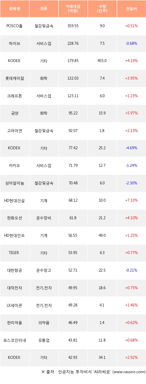 POSCO홀딩스, KODEX 코스닥150선물인버스, 롯데케미칼 등은 전일 대비 주가가 상승했고, 하이브, KODEX 2차전지산업, 카카오 등은 주가가 하락했다.