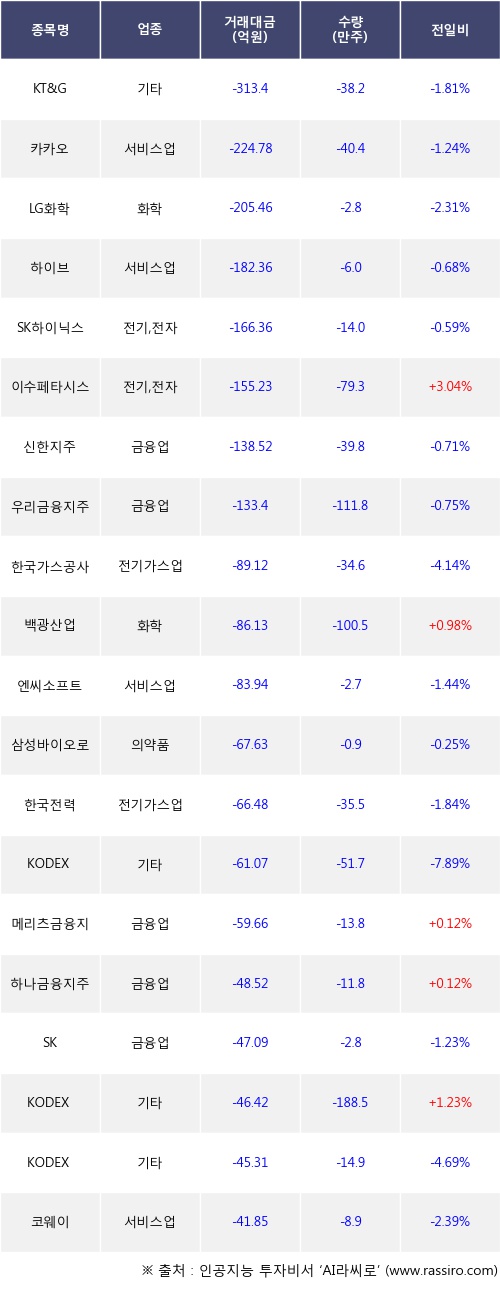 외국인 투자자의 순매도 상위 20개 종목은 KT&G, 카카오, LG화학, 하이브, SK하이닉스, 이수페타시스, 신한지주, 우리금융지주, 한국가스공사, 백광산업등이다.