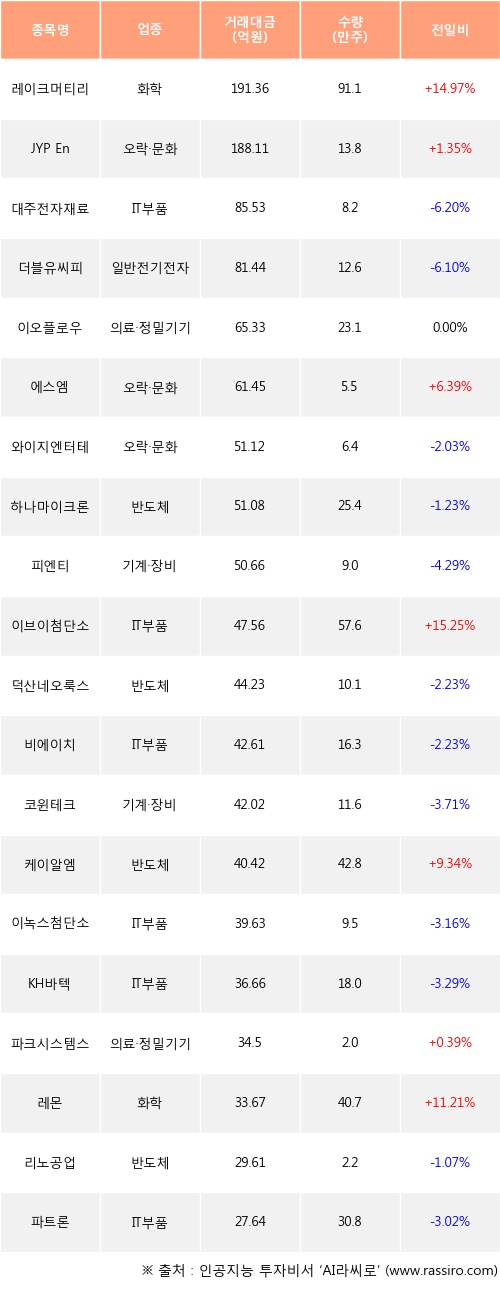 레이크머티리얼즈, JYP Ent., 에스엠 등은 전일 대비 주가가 상승했고, 대주전자재료, 더블유씨피, 와이지엔터테인먼트 등은 주가가 하락했다.
