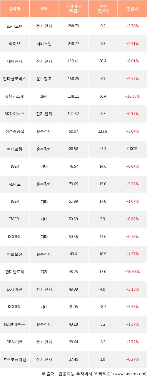 기관 투자자의 순매수 상위 20개 종목은 LG이노텍, 하이브, 대덕전자, 현대글로비스, PI첨단소재, SK하이닉스, 삼성중공업, 현대로템, TIGER CD금리투자KIS(합성), HL만도등이다.