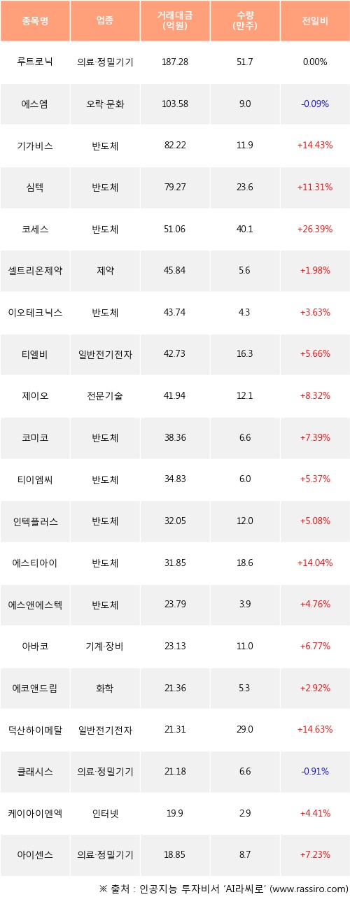 기관 투자자의 순매수 상위 20개 종목은 루트로닉, 에스엠, 기가비스, 심텍, 코세스, 셀트리온제약, 이오테크닉스, 티엘비, 제이오, 코미코등이다.