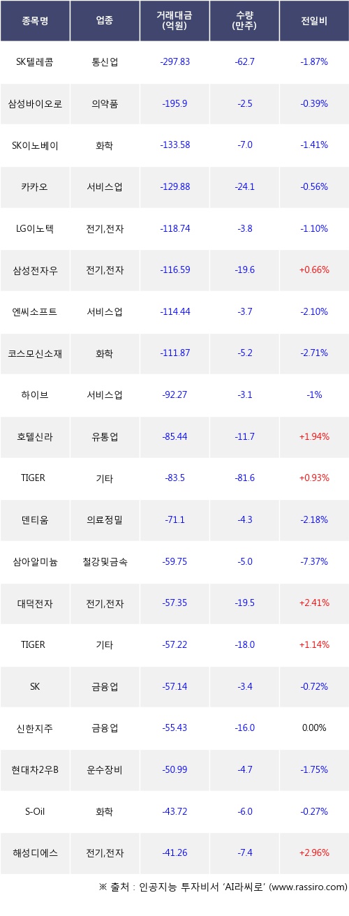 외국인 투자자의 순매도 상위 20개 종목은 SK텔레콤, 삼성바이오로직스, SK이노베이션, 카카오, LG이노텍, 삼성전자우, 엔씨소프트, 코스모신소재, 하이브, 호텔신라등이다.