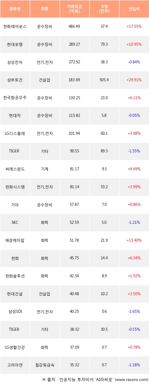 한화에어로스페이스, 현대로템, 삼부토건 등은 전일 대비 주가가 상승했고, 삼성전자, 현대차, TIGER 차이나전기차SOLACTIVE 등은 주가가 하락했다.