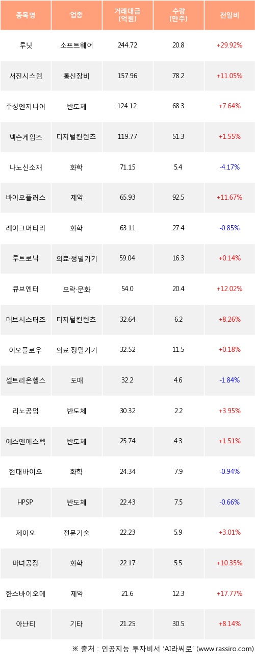 외국인 투자자의 순매수 상위 20개 종목은 루닛, 서진시스템, 주성엔지니어링, 넥슨게임즈, 나노신소재, 바이오플러스, 레이크머티리얼즈, 루트로닉, 큐브엔터, 데브시스터즈등이다.