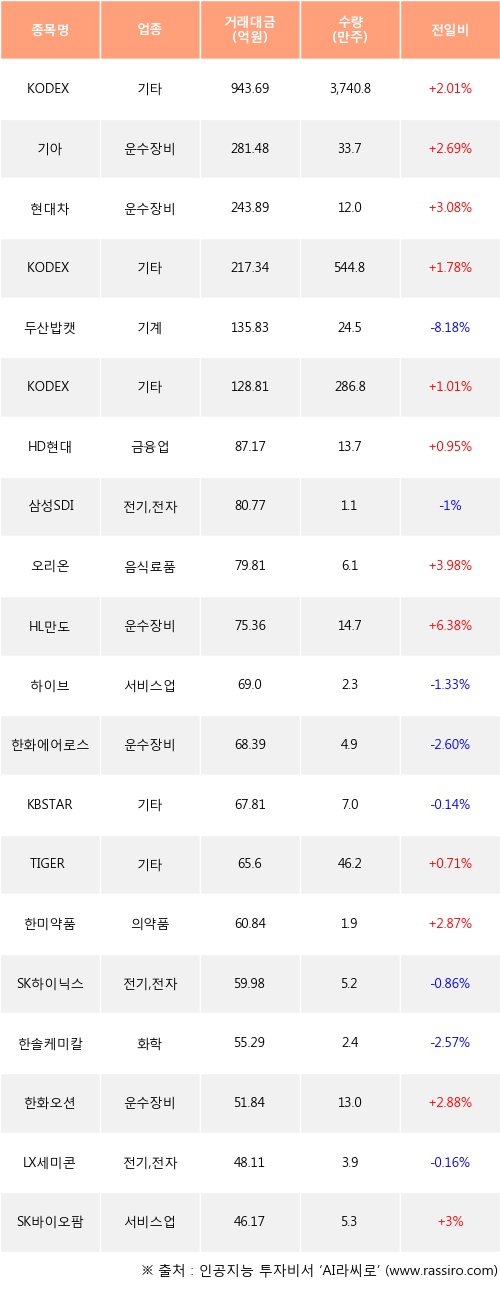 KODEX 200선물인버스2X, 기아, 현대차 등은 전일 대비 주가가 상승했고, 두산밥캣, 삼성SDI, 하이브 등은 주가가 하락했다.