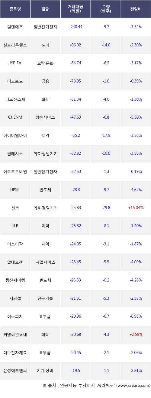 기관 투자자의 순매도 상위 20개 종목은 엘앤에프, 셀트리온헬스케어, JYP Ent., 에코프로, 나노신소재, CJ ENM, 에이비엘바이오, 클래시스, 에코프로비엠, HPSP등이다.