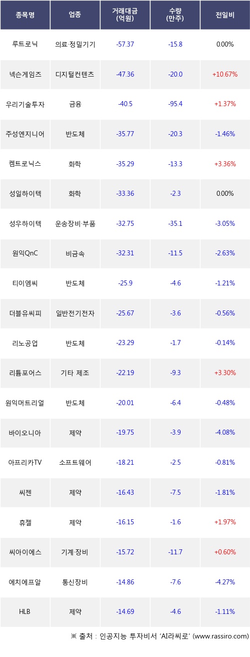 외국인 투자자의 순매도 상위 20개 종목은 루트로닉, 넥슨게임즈, 우리기술투자, 주성엔지니어링, 켐트로닉스, 성일하이텍, 성우하이텍, 원익QnC, 티이엠씨, 더블유씨피등이다.