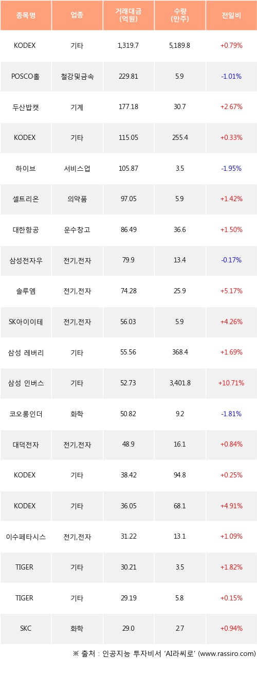 KODEX 200선물인버스2X, 두산밥캣, KODEX 인버스 등은 전일 대비 주가가 상승했고, POSCO홀딩스, 하이브, 삼성전자우 등은 주가가 하락했다.