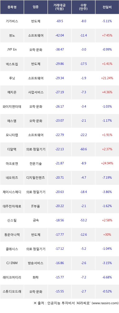 기관 투자자의 순매도 상위 20개 종목은 기가비스, 뷰노, JYP Ent., 넥스트칩, 루닛, 메지온, 와이지엔터테인먼트, 에스엠, 모니터랩, 디알텍등이다.
