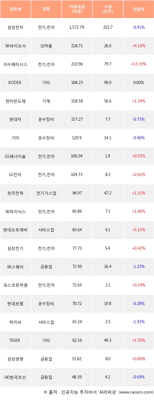 SK바이오사이언스, 이수페타시스, 한미반도체 등은 전일 대비 주가가 상승했고, 삼성전자, 현대차, 기아 등은 주가가 하락했다.