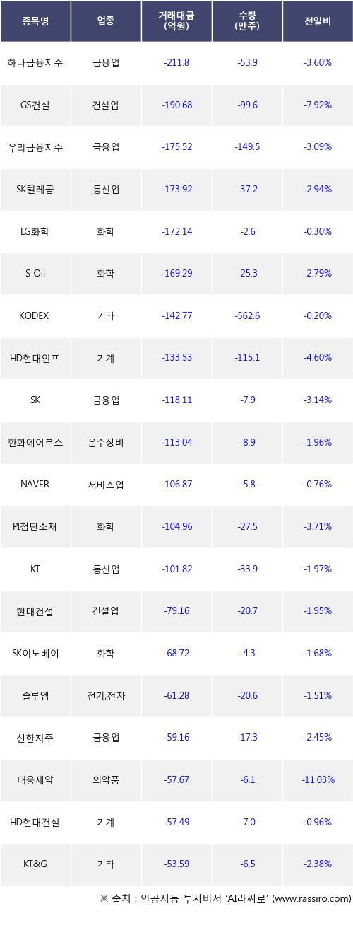 외국인 투자자의 순매도 상위 20개 종목은 하나금융지주, GS건설, 우리금융지주, SK텔레콤, LG화학, S-Oil, KODEX 200선물인버스2X, HD현대인프라코어, SK, 한화에어로스페이스등이다.