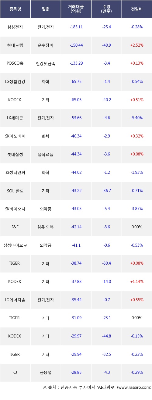 기관 투자자의 순매도 상위 20개 종목은 삼성전자, 현대로템, POSCO홀딩스, LG생활건강, KODEX 레버리지, LX세미콘, SK이노베이션, 롯데칠성, 효성티앤씨, SOL 반도체소부장Fn등이다.