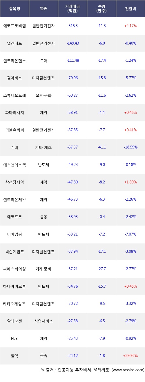 기관 투자자의 순매도 상위 20개 종목은 에코프로비엠, 엘앤에프, 셀트리온헬스케어, 펄어비스, 스튜디오드래곤, 파마리서치, 더블유씨피, 꿈비, 에스앤에스텍, 삼천당제약등이다.