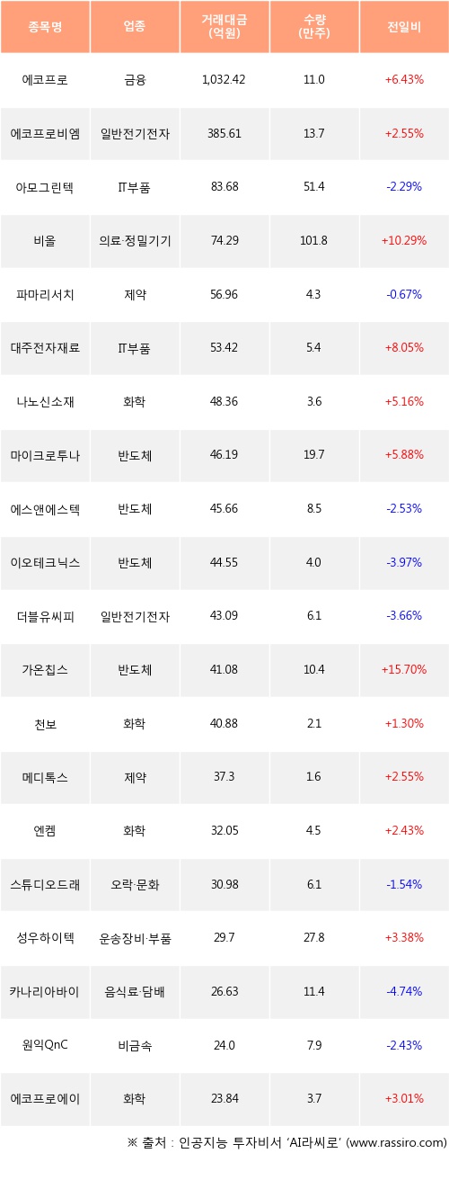에코프로, 에코프로비엠, 비올 등은 전일 대비 주가가 상승했고, 아모그린텍, 파마리서치, 에스앤에스텍 등은 주가가 하락했다.