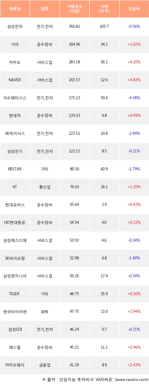 기아, 카카오, NAVER 등은 전일 대비 주가가 상승했고, 삼성전자, 이수페타시스, SK하이닉스 등은 주가가 하락했다.