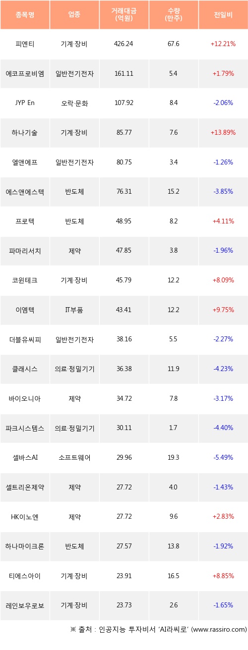 외국인 투자자의 순매수 상위 20개 종목은 피엔티, 에코프로비엠, JYP Ent., 하나기술, 엘앤에프, 에스앤에스텍, 프로텍, 파마리서치, 코윈테크, 이엠텍등이다.
