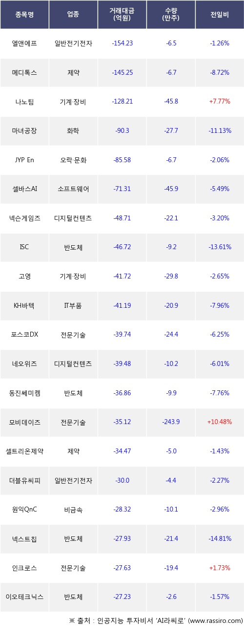 기관 투자자의 순매도 상위 20개 종목은 엘앤에프, 메디톡스, 나노팀, 마녀공장, JYP Ent., 셀바스AI, 넥슨게임즈, ISC, 고영, KH바텍등이다.