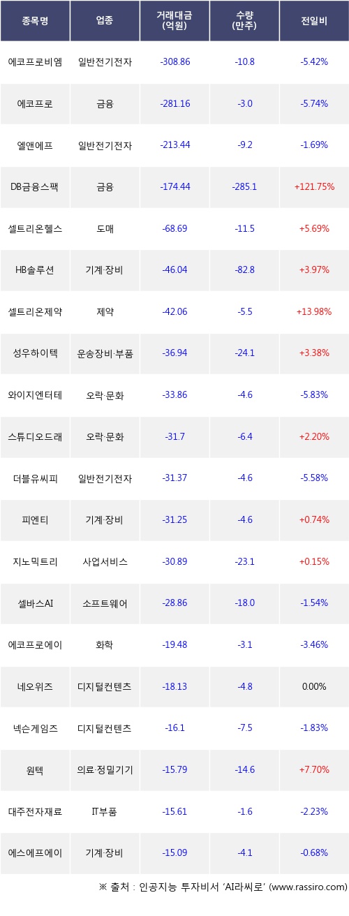 기관 투자자의 순매도 상위 20개 종목은 에코프로비엠, 에코프로, 엘앤에프, DB금융스팩11호, 셀트리온헬스케어, HB솔루션, 셀트리온제약, 성우하이텍, 와이지엔터테인먼트, 스튜디오드래곤등이다.