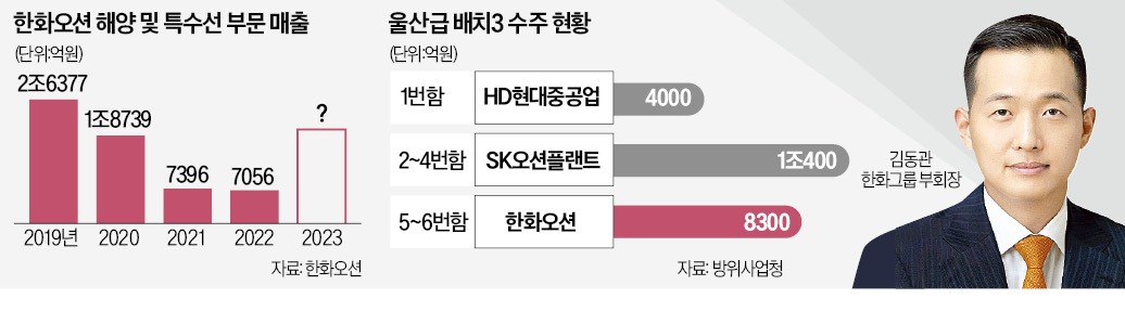 한화오션의 전체 매출에서 방위산업 부문이 차지하는 비중은 10% 정도다. 이번 울산급 배치3 수주를 따내며 방산 사업에서 일감을 마련한 터라 앞으로 매출이 더 늘어날 전망이다. 김 부회장은 지난달 7일 ‘국제해양방위산업전(MADEX) 2023’에서 “한화오션 합류로 한화에어로스페이스, 한화시스템과 많은 분야에서 시너지를 낼 것으로 확신한다”고 말했다.
